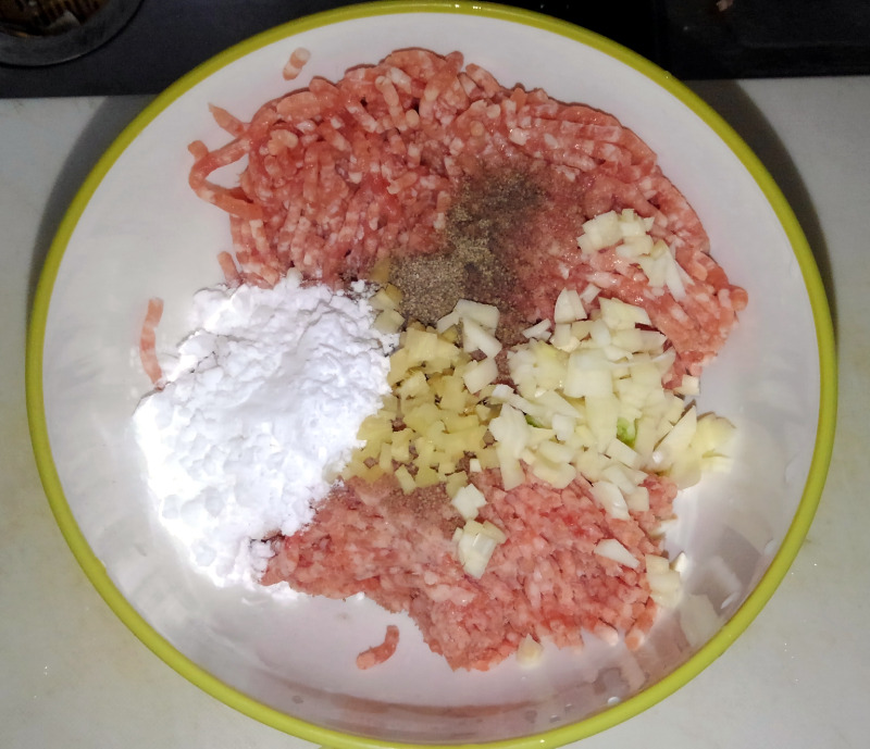 豚ひき肉に塩コショウ、ショウガ、ニンニク、片栗粉を混ぜて練り、ハンバーグ状にします。