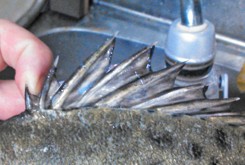 背鰭が非常に鋭いので、手に刺さってしまわないよう細心の注意を払い進める。