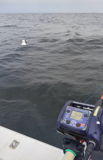 巻き上げの途中、魚が外れずにかかっていると、500mを切ったあたりでグイグイと強く竿先が引き込まれる。