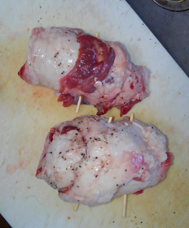 塩コショウをすりこみ、端からくるくると巻いて串でとめて、