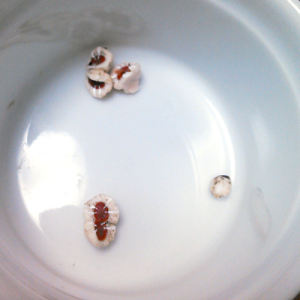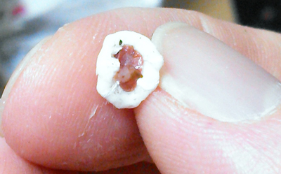 さてこのツノロウムシ、木から剥がしてひっくり返してみると、中心部分が真っ赤になっている。