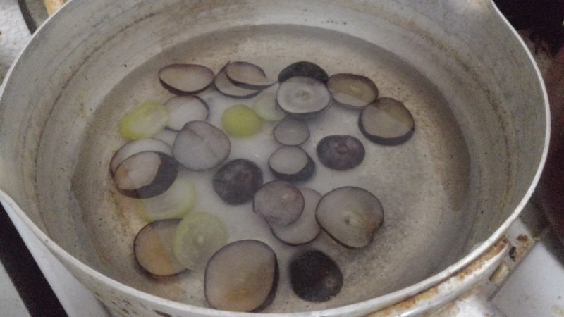 できた液体で、あく抜きをした自然薯を煮ていきます。シャリシャリした食感が好きな人は1分程度、ホクホクが好きな人は3分ほどしっかりと火を通しましょう。