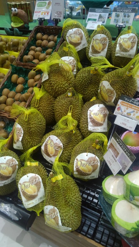 先日、武蔵小杉のスーパーマーケットに肉を買いにいったら、入り口にドリアンが鎮座ましましてました。