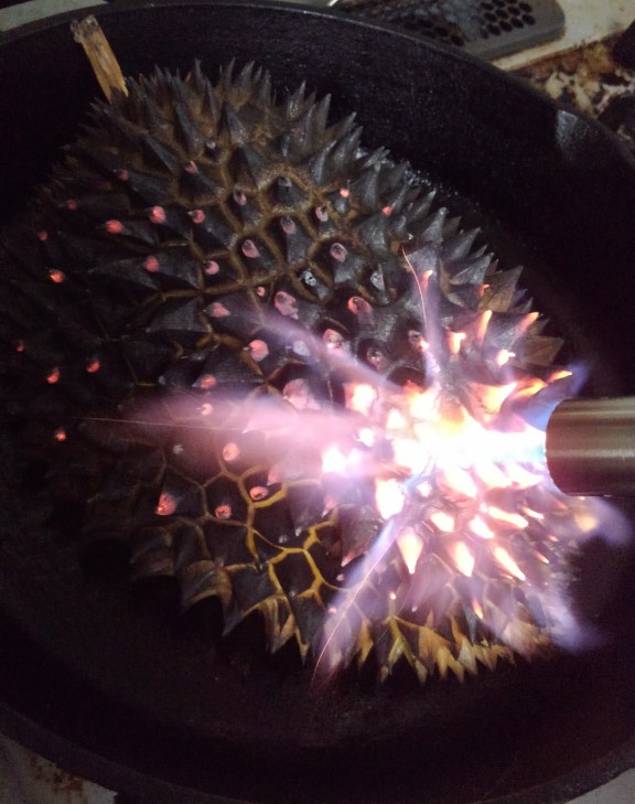 なんでも、ドリアンを皮ごと丸焼きにして食べるというダイナミック極まりない料理だそう。料理ともいえないかも。